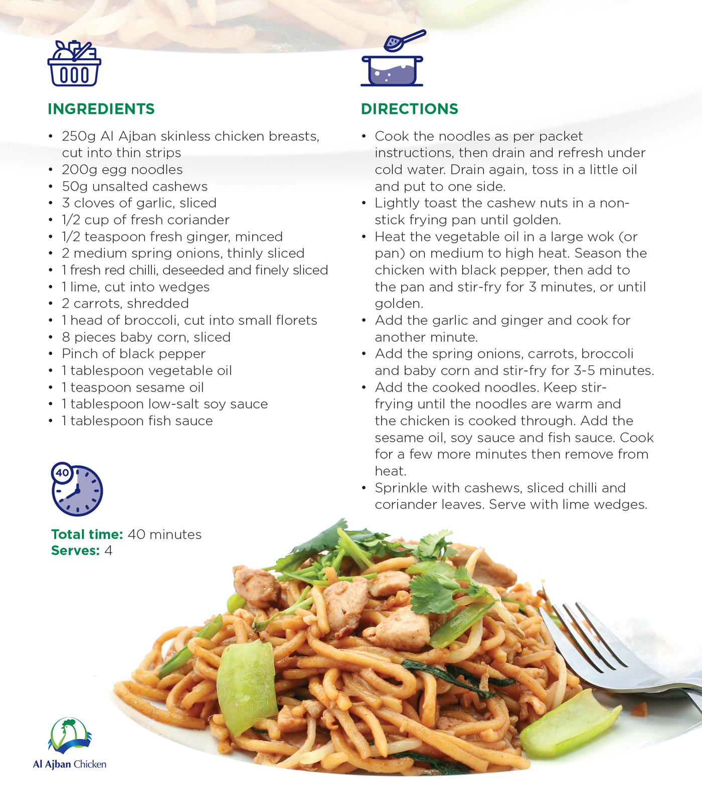 Ingredients • 250g Al Ajban skinless chicken breasts, cut into thin strips • 200g egg noodles • 50g unsalted cashews • 3 cloves of garlic, sliced • 1/2 cup of fresh coriander • 1/2 teaspoon fresh ginger, minced • 2 medium spring onions, thinly sliced • 1 fresh red chilli, deseeded and finely sliced • 1 lime, cut into wedges • 2 carrots, shredded • 1 head of broccoli, cut into small florets • 8 pieces baby corn, sliced • Pinch of black pepper • 1 tablespoon vegetable oil • 1 teaspoon sesame oil • 1 tablespoon low-salt soy sauce • 1 tablespoon fish sauce |