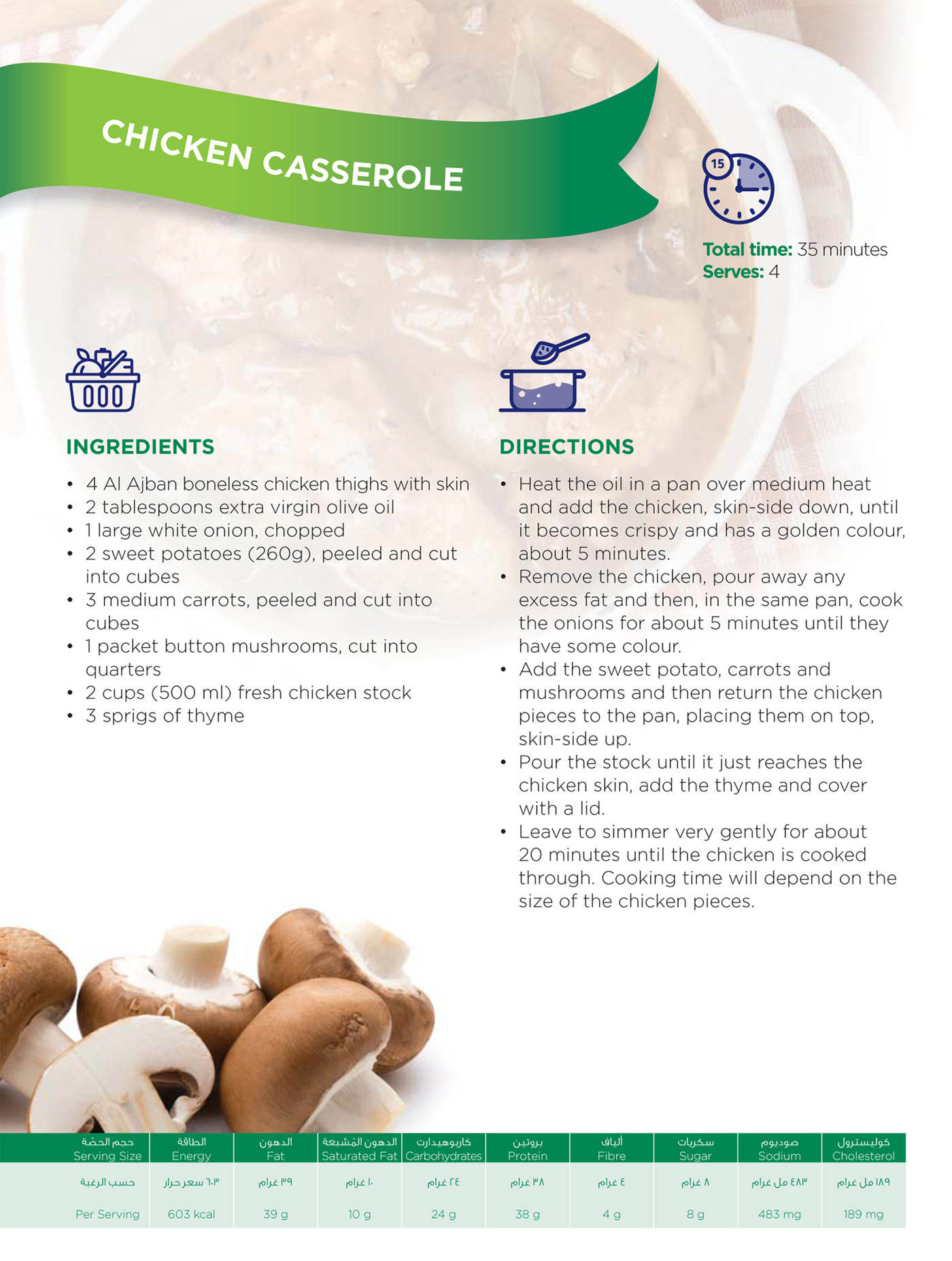 Ingredients • 4 Al Ajban boneless chicken thighs with skin • 2 tablespoons extra virgin olive oil • 1 large white onion, chopped • 2 sweet potatoes (260g), peeled and cut into cubes • 3 medium carrots, peeled and cut into cubes • 1 packet button mushrooms, cut into quarters • 2 cups (500ml) fresh chicken stock • 3 sprigs of thyme |
